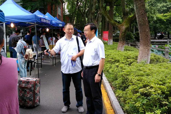 校領導依次來到各個學院的迎新點、學生事務大廳、監控中心,和學院師生親切交談,詳細了解各學院報到情況以及相關準備工作是否落實到位。