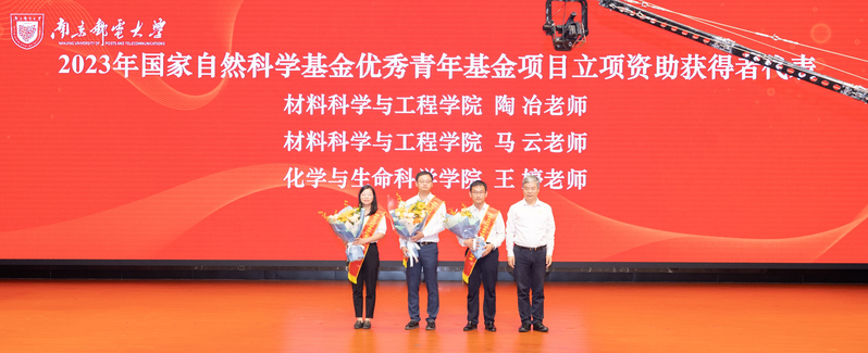 校黨委書記郭宇鋒為2023年國家自然科學基金優秀青年基金項目立項資助獲得者代表陶冶老師、馬云老師、王婷老師頒發綬帶