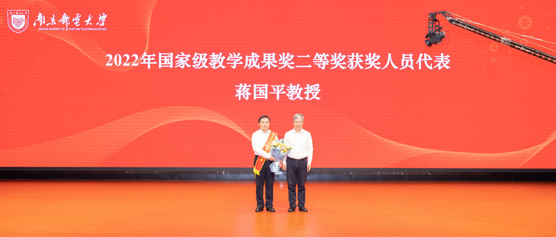 校黨委書記郭宇鋒為2022年國家級教學成果獎二等獎獲獎人員代表蔣國平教授頒發綬帶
