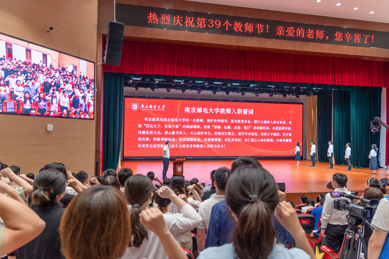 金秋九月,碩果盈枝。9月8日上午,我校在仙林校區安恒青春劇場召開大會隆重慶祝第39個教師節。校黨委書記郭宇鋒,校黨委副書記蔣國平,校黨委常委、副校長姜小舜,校黨委常委、紀委書記、省監委派駐南京郵電大學監察專員龔親華,校黨委常委、副校長肖甫,校黨委常委、副校長劉青山,校黨委常委、副校長謝平,副校長趙強,各職能部門、各學院代表,榮休教職工、從教滿30周年教職工、新入職教職工、教師代表、學生代表等出席會議。大會通過視頻直播,各單位、各學院設置分會場,以觀看直播的方式線上參會。大會由校黨委副書記蔣國平主持。