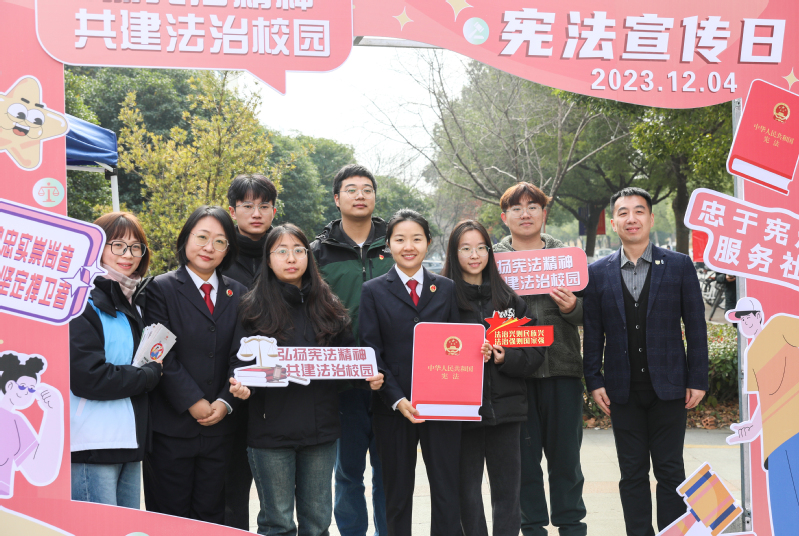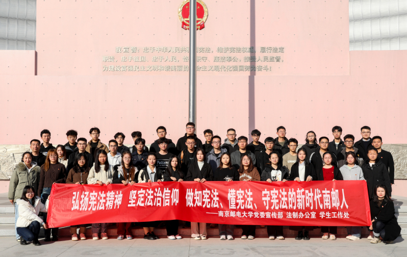 實(shí)踐活動樹信仰。12月7日,校黨委宣傳部、法制辦公室、學(xué)生工作處相關(guān)工作人員和通信與信息工程學(xué)院、化學(xué)與生命科學(xué)學(xué)院、物聯(lián)網(wǎng)學(xué)院、現(xiàn)代郵政學(xué)院學(xué)生代表赴南京憲法公園開展憲法主題實(shí)踐活動。在憲法宣誓廣場,高高掛起的“推動憲法實(shí)施”“深入學(xué)習(xí)貫徹習(xí)近平法治思想”宣傳標(biāo)語映入眼簾,景墻上的浮雕深深鐫刻了在歷史行進(jìn)史冊中“以人民為中心”的重大主題,同學(xué)們紛紛駐足學(xué)習(xí),不時(shí)交流討論。在憲法宣傳教育展廳,學(xué)子們從“尋憲”“制憲”“修憲”“奉憲”四個(gè)方面,了解中國共產(chǎn)黨帶領(lǐng)中國人民制定、發(fā)展、完善、實(shí)施憲法的偉大歷史進(jìn)程。離開宣傳展廳后,學(xué)子們在憲法宣誓廣場國旗前合影留念,感悟憲法力量,弘揚(yáng)法治精神。