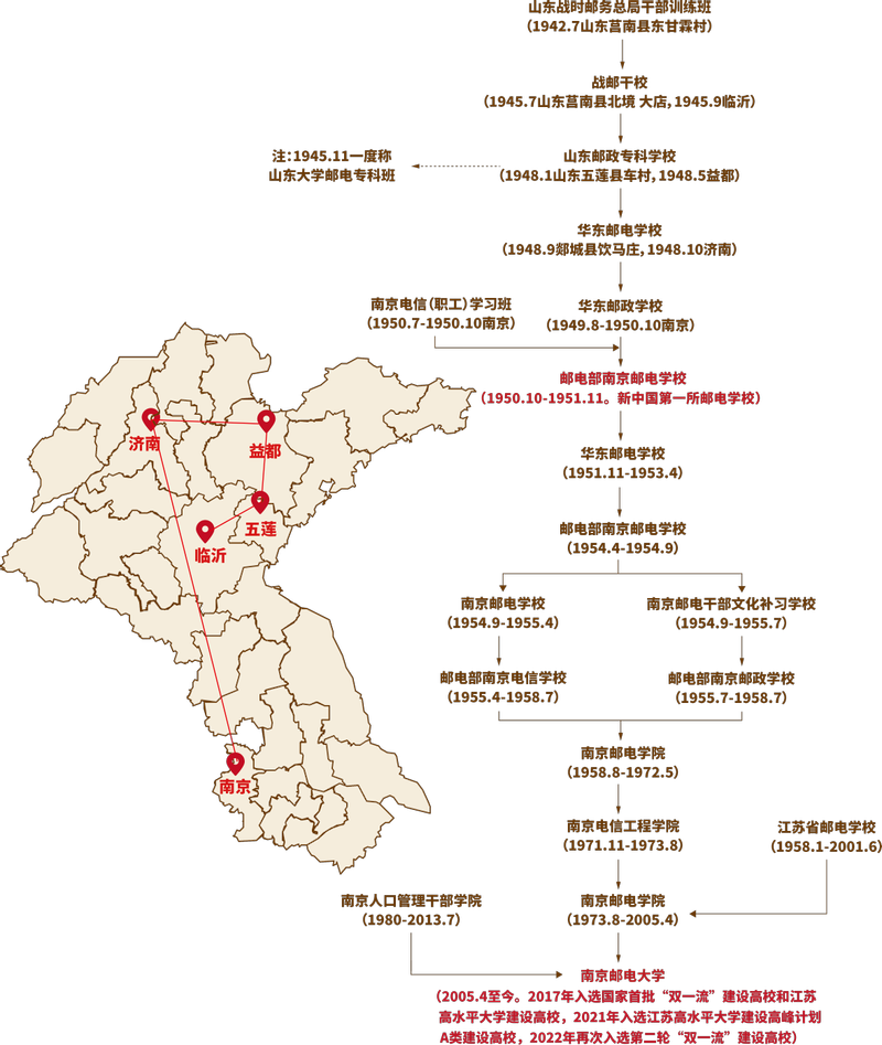 南京郵電大學(xué)成立于1958年,連同前身,校史歷經(jīng)80余年。其前身最早是1942年創(chuàng)辦于山東濱海抗日民主根據(jù)地的“戰(zhàn)時(shí)郵務(wù)總局干部訓(xùn)練班”,1945年7月訓(xùn)練班擴(kuò)建為“戰(zhàn)郵”學(xué)校,嗣后,一度稱為山東大學(xué)郵電專科部及山東郵政專科學(xué)校。校址先后輾轉(zhuǎn)在魯南、臨沂、五蓮等地。在1942年至 1947年間,訓(xùn)練班主任及嗣后學(xué)校校長(zhǎng)均由當(dāng)時(shí)戰(zhàn)郵總局局長(zhǎng)趙志剛兼任。(趙志剛在建國(guó)后曾長(zhǎng)期擔(dān)任郵電部副部長(zhǎng)主管郵電教育工作。)1948年,學(xué)校在益都(青州)定名華東郵電學(xué)校,隸屬于當(dāng)時(shí)華東郵電管理總局。1949年8月,學(xué)校從山東濟(jì)南遷到南京市。在1942年至1949年建國(guó)之前的八年間,學(xué)校為革命戰(zhàn)爭(zhēng)培養(yǎng)了一批急需的郵電通信中堅(jiān)人才。
