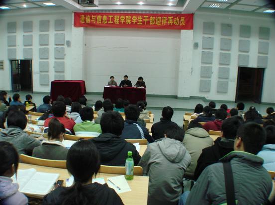 朱洪波院長首先作了迎評動員講話,他分別就迎評的重要性,迎評形勢的嚴峻性,本科教學評估的目的,學院人才培養的目標,迎評的日程安排等進行了介紹和分析。他特別強調:學院人才培養目標的三個層次,即“生存能力強,發展潛力大,綜合素質高”,全院的迎評和發展工作都要圍繞這個目標;“以評促建,以評促改,以評促管,評建結合,重在建設”這二十字迎評方針每位同學要牢記。朱院長指出:教學的結果最終要體現在每位同學身上,同學們是本科教學評估的主體,要發揚主人翁意識,課堂風氣、學習風氣要狠抓不放松。最后,朱洪波院長要求在座的學生骨干把會議精神傳達到每一位同學,做好再動員工作,讓“迎評創優”深入人心,為學院創優盡一份力,為學校評優作出應有的貢獻。