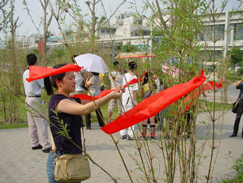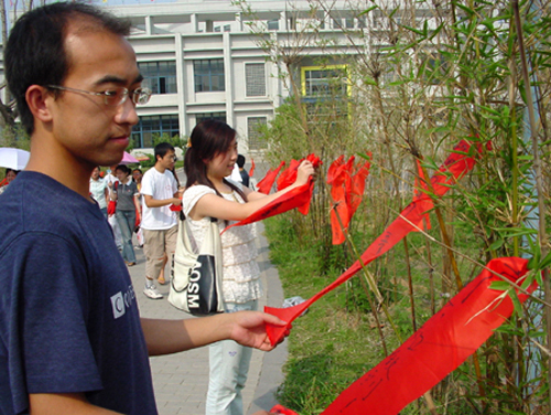 中國江蘇網消息:6月17日下午,南京郵電大學一群即將畢業的大四學生來到仙林校區,將一條條紅絲帶系在學徑兩邊的竹枝上,“請記住陽光總在風雨后,一起加油吧!”、“一個今天勝過兩個明天”、“寄語學弟學妹:努力與快樂同在!”、“當自己都不知自己在干什么的時候,就是該好好思考自己的時候”、“重要的不是所站的位置,而是所朝的方向”、“少玩游戲,多上自習”、“I believe you can fly”……,這些紅絲帶上的話語,有的是自身的經驗傳授,有的是發自內心的祝福,有的是誠懇的勸勉,飄揚的絲帶引來不少在仙林的南郵學子駐足觀看,以紅絲帶表達學長的心意這種方式,讓平時較少有機會接觸學長的一二三年級學生以一種別樣的心情感受到了溫情的傳遞。