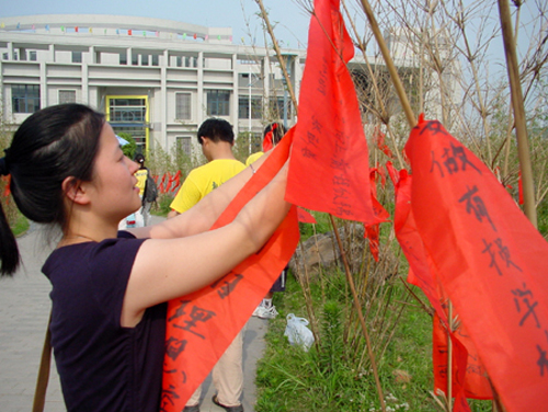 這是南郵畢業生文明離校的系列活動之一——“心語傾訴:向親愛的師弟、師妹進言”。此外還有以傳授考研經驗為主題的“澤被同門——01級仙林送經”以及在系旗上簽字等活動。03年南郵仙林新校區投入使用,兩地辦學使本部和仙林學生之間的交流相對比較困難,而本屆畢業生既是最后一屆南京郵電學院畢業生,又是第一屆南京郵電大學畢業生,同時還是最后一屆四年在本部度過的畢業生,作為最后一屆從環境到精神完全承接著南郵學子風格的畢業生,他們在畢業前夕,以一種有別于以往的方式離別母校,而有這屆畢業生簽名的各系系旗也將完成它們的使命在校史館永久保存。