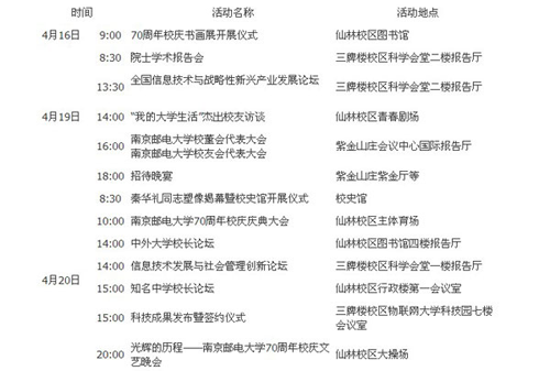 校慶期間,南郵大的學生還將有機會與杰出校友進行面對面交流。期間還將舉辦重點中學校長論壇、秦華禮同志塑像揭幕暨校史館開展儀式和科技成果發布暨簽約儀式等多項豐富多彩的活動。