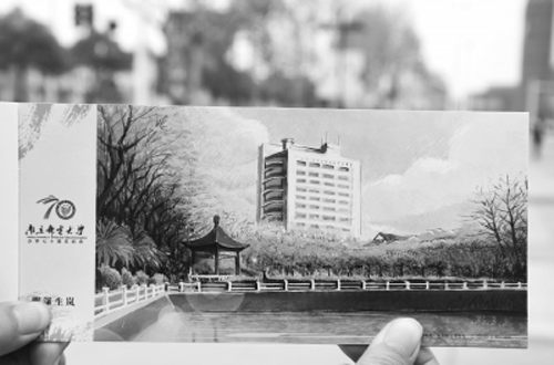 明信片由專業人士手繪而成,式樣精美、新穎、獨特(如上圖 本報記者 談潔攝)。據悉,“南郵七景”手繪明信片將發行2.8萬套,所有學生和參加學校70周年慶典的校友都有機會領取一套。