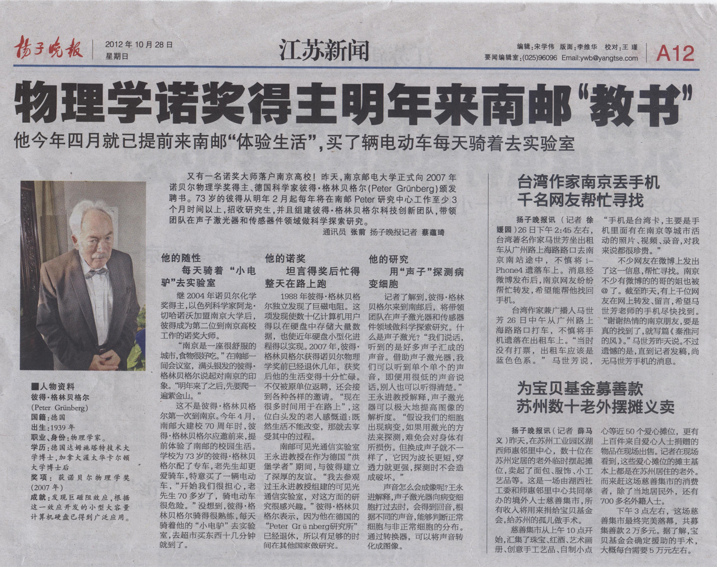 【揚子晚報】物理學諾獎得主明年來南郵教書