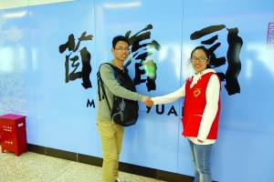 于是,5個年輕人在拍照的同時,增添了一項“特別”的內容——與陌生人握手并合影。在每一站臺內,他們主動上前找一個陌生人,告訴這個陌生人他們正在做的活動,并且邀請他一起合影。合影之后,幾個年輕人也特意送上自制的一個愛心徽章,以感謝這個愿意配合的陌生人。