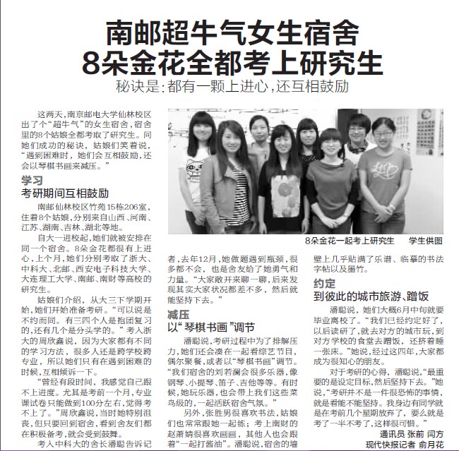 【現代快報】南郵超牛氣女生宿舍 8朵金花全都考上研究生