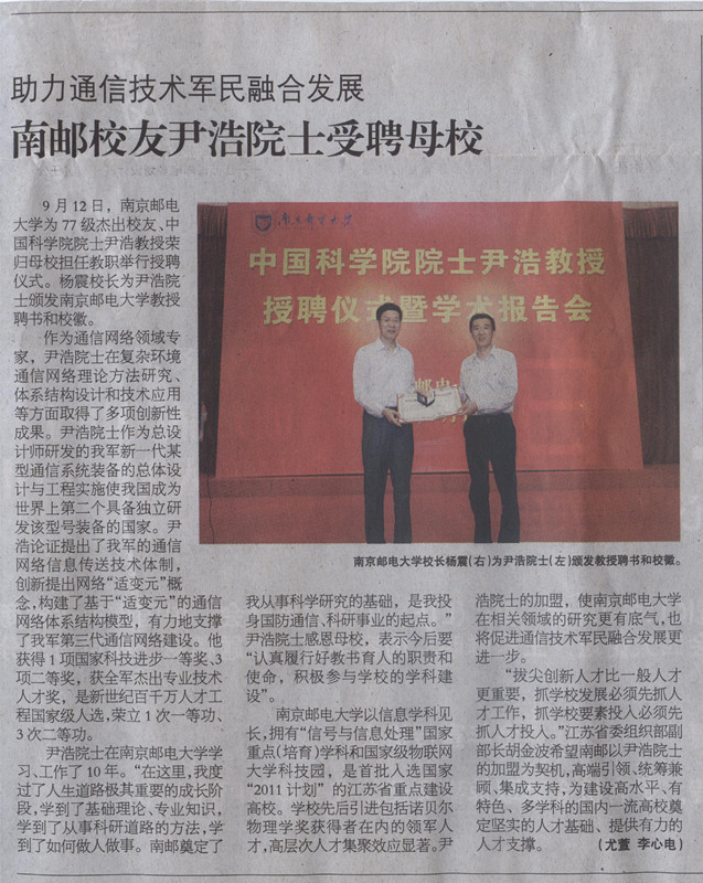 【人民郵電報】南郵校友尹浩院士受聘母校