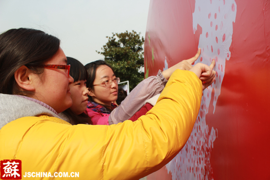 值得一提的是,南郵的“南京大屠殺死難者國(guó)家公祭日”活動(dòng)也同時(shí)舉行。在“眾‘指’成城“活動(dòng)區(qū),一塊紅色的展板中間鑲嵌一幅白色的中國(guó)地圖,同學(xué)們將自己紅色的拇指印填充在白色的中國(guó)地圖上。不一會(huì)兒,白色地圖上就印滿了紅色的拇指印。“這項(xiàng)活動(dòng),寓意中國(guó)的年輕人不忘國(guó)恥,捍衛(wèi)祖國(guó)領(lǐng)土完整。”張建穎老師介紹。電子科學(xué)與技術(shù)學(xué)院的學(xué)生孔令強(qiáng)則把拇指印按在了他的家鄉(xiāng)福建省的位置。“公祭活動(dòng)很有必要,這不僅是對(duì)死難者的尊重,更是對(duì)后人的警示。”記者看到地圖上釣魚島、南海等處滿是紅紅的拇指印。