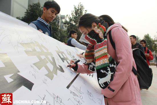 在橫幅上,南郵學(xué)子簽下自己的名字。