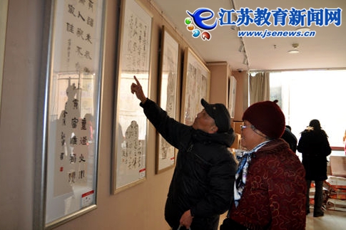 畫展現場,前來參觀的一對老年夫婦正在欣賞南郵退休教師、畫家張少武的畫作。他倆對記者說:“ 我們在老年大學學習畫畫,張少武老師給我們上過課呢!”