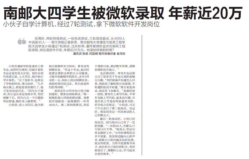 【現代快報】南郵大四學生被微軟錄取 年薪近20萬