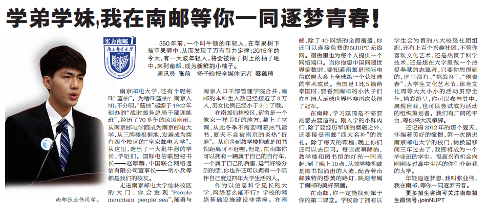 【揚子晚報】學弟學妹,我在南郵等你一同逐夢青春!