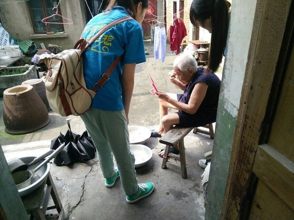 在東溝鎮當地人的指引下,志愿者來到了李爺爺和劉奶奶家。兩位老人年齡都非常大了,見到志愿者來,兩位老人充滿了疑惑。志愿者趕快走上前說是志愿服務的。但他們的熱情引起了防范,“你們要不要錢,我們沒錢!”李奶奶疑惑地說。胡婷婷趕快上前說明來意,兩位老人這才同意稍稍釋懷。