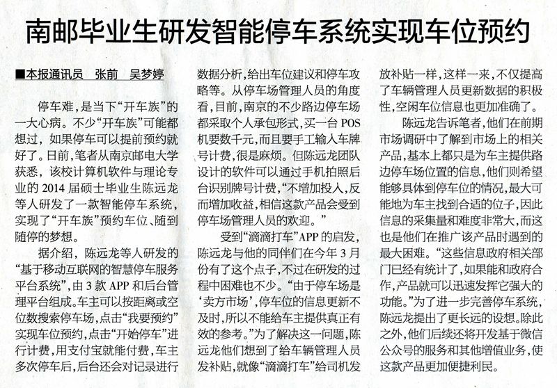 【江蘇教育報】南郵畢業生研發智能停車系統實現車位預約