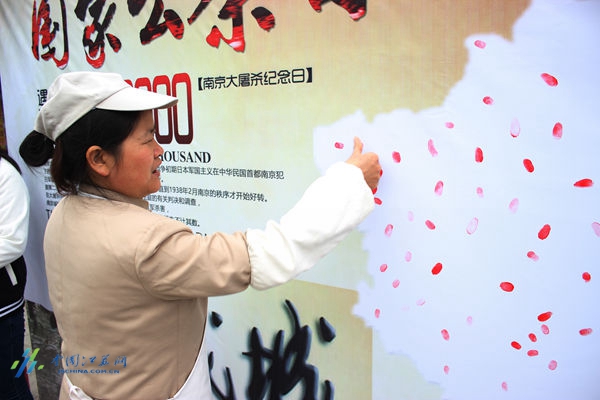活動現(xiàn)場由“和平之花”——佩戴紫金草徽章行動、“墨哀英魂”——主題書法展、“眾指成城”——指印寄思等別出心裁、內(nèi)涵豐富、寓意深刻的系列活動組成。上午十時(shí)零一分,隨著防空警報(bào)聲在南京上空響起,在場同學(xué)佩帶著象征和平的紫金草徽章集體默哀。隨后,同學(xué)們依次參觀了書法作品展,在中國地圖上按下紅色指印,并在“國行公祭,祀我國殤。永矢弗諼,祈愿和平”的標(biāo)語上簽名,表明了同學(xué)們齊心協(xié)力,攜手共進(jìn),誓親手捍衛(wèi)祖國領(lǐng)土完整的決心。