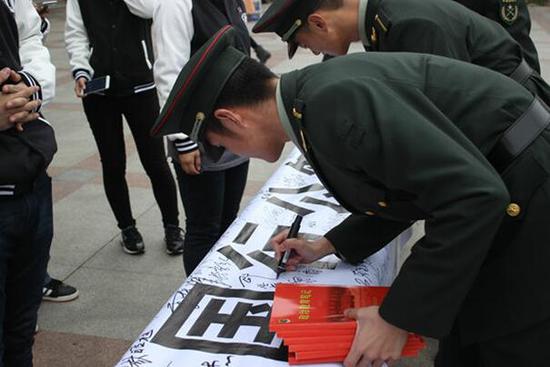 活動(dòng)現(xiàn)場(chǎng)由“和平之花”——佩戴紫金草徽章行動(dòng)、“墨哀英魂”——主題書(shū)法展、“眾指成城”——指印寄思等別出心裁、內(nèi)涵豐富、寓意深刻的系列活動(dòng)組成。上午十時(shí)零一分,隨著防空警報(bào)聲在南京上空響起,在場(chǎng)同學(xué)佩帶著由南京廣播電視臺(tái)發(fā)放的象征和平的紫金草徽章集體默哀。隨后,活動(dòng)有序開(kāi)展,同學(xué)們依次參觀了書(shū)法作品展,在中國(guó)地圖上按下紅色指印,并在 “國(guó)行公祭,祀我國(guó)殤。永矢弗諼,祈愿和平”的標(biāo)語(yǔ)上簽名,表明了同學(xué)們齊心協(xié)力,攜手共進(jìn),誓親手捍衛(wèi)祖國(guó)領(lǐng)土完整的決心。本次系列活動(dòng)由12月9日的“金陵名人堂”報(bào)告會(huì)拉開(kāi)序幕,報(bào)告會(huì)邀請(qǐng)了侵華日軍南京大屠殺遇難同胞紀(jì)念館副館長(zhǎng)陳俊峰先生進(jìn)行有關(guān)日軍侵華史的演講,激發(fā)了南郵學(xué)子的愛(ài)國(guó)熱情。