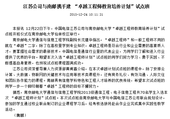 【江蘇郵電報(bào)】江蘇公司與南郵攜手建“卓越工程師教育培訓(xùn)計(jì)劃”試點(diǎn)班