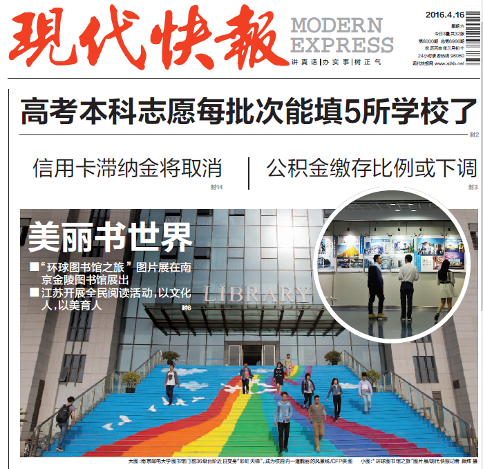 【現代快報】南京郵電大學圖書館門前的臺階近日變身“彩虹天梯”(封面圖)