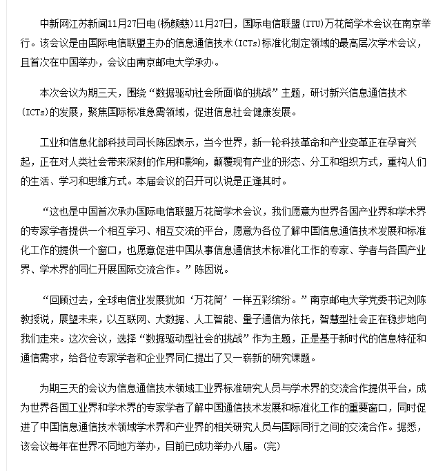【中國新聞網】國際電信聯盟萬花筒學術會議在南京召開