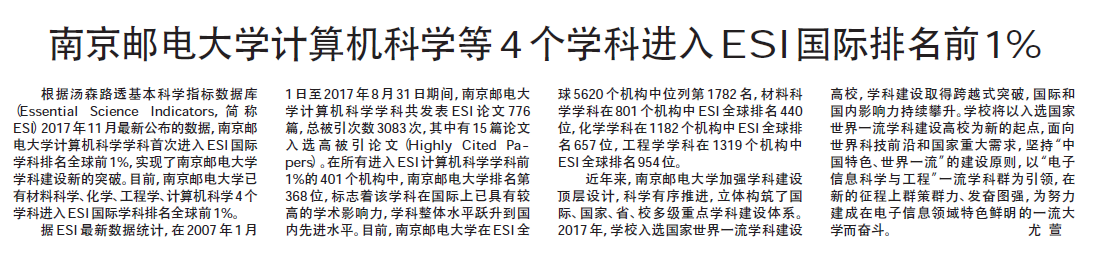 【新華日報】南京郵電大學計算機科學等4個學科進入ESI國際排名前1%