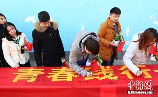 大學生們在“青春踐行”的標語上簽名。 泱波 攝