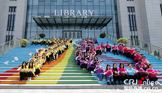 師生在圖書館門前的階梯上擺出“76”的造型迎校慶 尤萱 攝