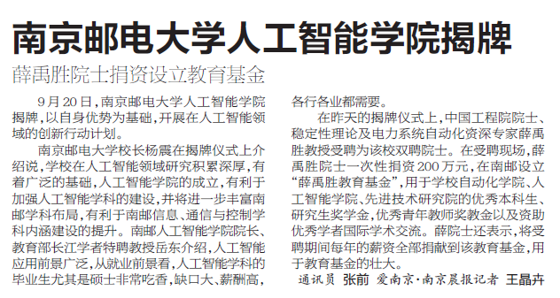 【南京晨報】南京郵電大學人工智能學院揭牌