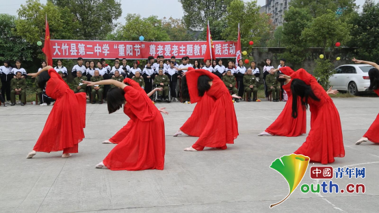 南京郵電大學(xué)研支團(tuán)四川分隊(duì)組織大竹縣二中學(xué)生到縣光榮院看望慰問(wèn)退伍老兵。圖為大竹縣二中學(xué)生們?yōu)橥宋槔媳硌莨?jié)目。南京郵電大學(xué)研支團(tuán) 供圖