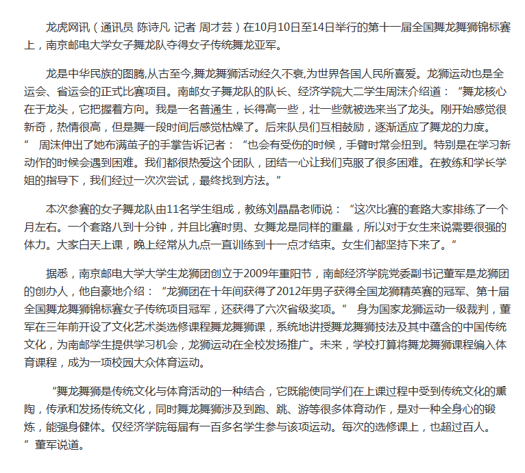 【龍虎網】南郵獲第十一屆全國舞龍舞獅錦標賽女子傳統舞龍亞軍