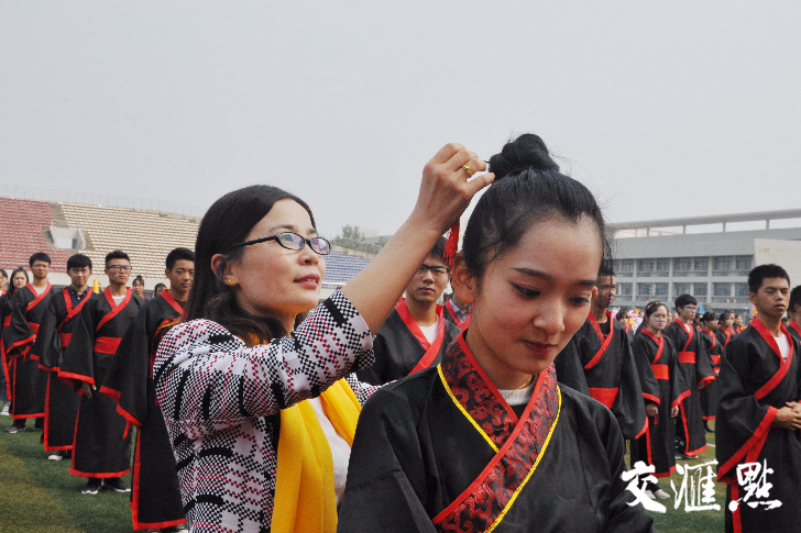活動現(xiàn)場,經(jīng)濟(jì)學(xué)院的部分院領(lǐng)導(dǎo)、關(guān)工委代表、三十年以上教齡的教師代表、新生班主任等數(shù)十人為學(xué)生代表加冠、及笄。其他學(xué)生自行加冠及笄。全體新生舉起右拳宣誓,誦讀成人禮誓詞。“第一次為學(xué)生加冠,我很激動,同時也感受到濃濃的尊師重教的氛圍。”有著33年教齡的尹勤教授說:“身為教師,一定要堅(jiān)持立德樹人,繼承孔子因材施教的思想,將教書與育人結(jié)合在一起。”