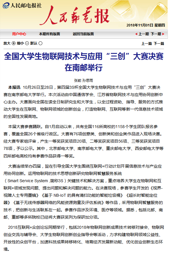 【人民郵電報】全國大學生物聯網技術與應用“三創”大賽決賽在南郵舉行