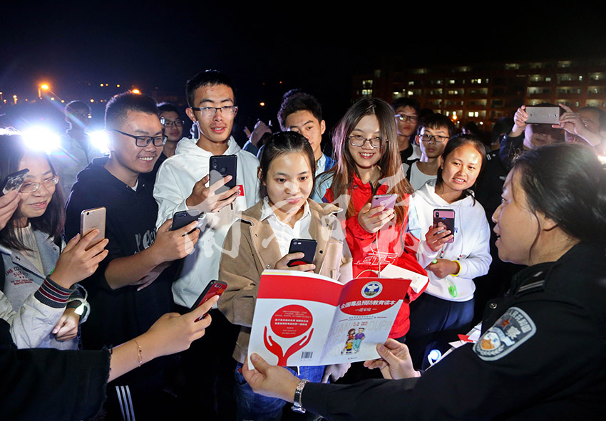 2018年10月28日晚,南京市禁毒辦,玄武區禁毒辦聯合合作單位,在南郵操場舉行一場“書約青春”禁毒教育活動,共有近千名各大院校大學生前來參加。南郵草坪上,擺放著近2000本包括文學、心理、禁毒等各類書籍,每本書上夾著小書燈,供大學生們閱讀。活動中,南京禁毒高校聯盟志愿者在展板前宣講禁毒知識,禁毒民警向大學生們推薦“南京禁毒”公眾號,展示禁毒書籍,現場回答大家提問,邀請大學生參加南京市禁毒高校聯盟,共同成為禁毒衛士。南報網記者 吳彬攝