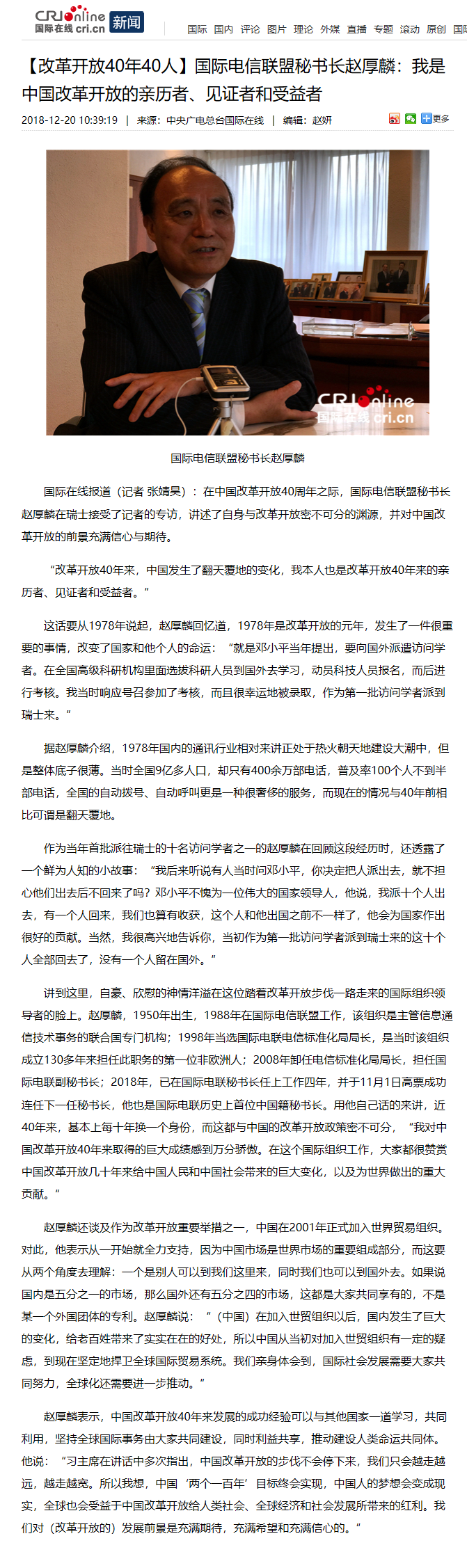 【中央廣電總臺國際在線】國際電信聯盟秘書長趙厚麟:我是中國改革開放的親歷者、見證者和受益者