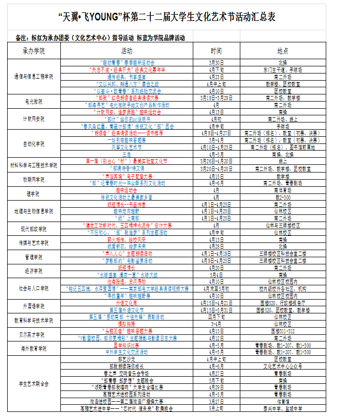 “天翼·飛YOUNG”杯第二十二屆大學生文化藝術節活動匯總表