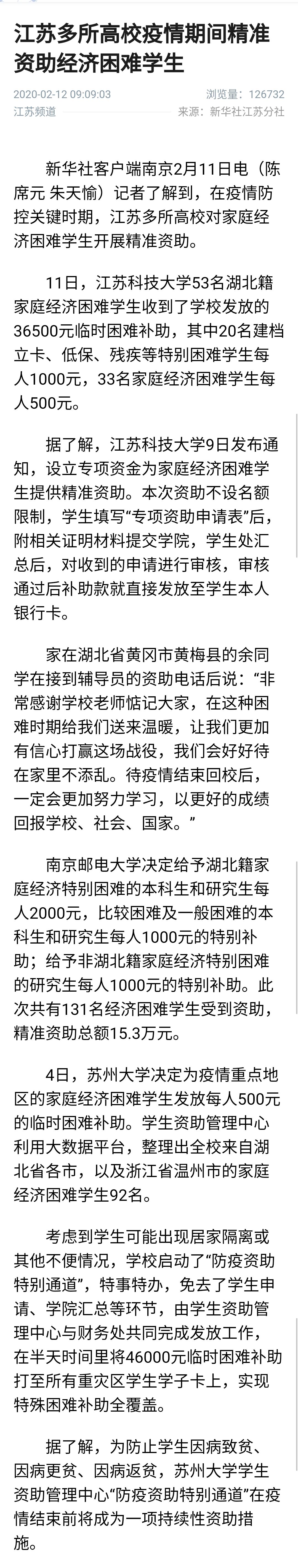 【新華社客戶端】江蘇多所高校疫情期間精準資助經濟困難學生