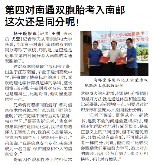 【揚子晚報】第四對南通雙胞胎考入南郵 這次還是同分呢!