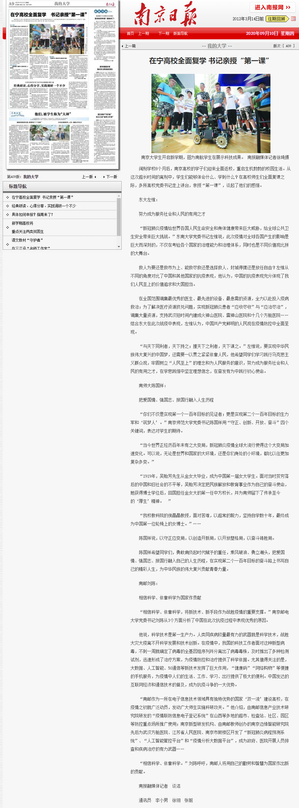 【南京日?qǐng)?bào)】在寧高校全面復(fù)學(xué) 書(shū)記親授“第一課”