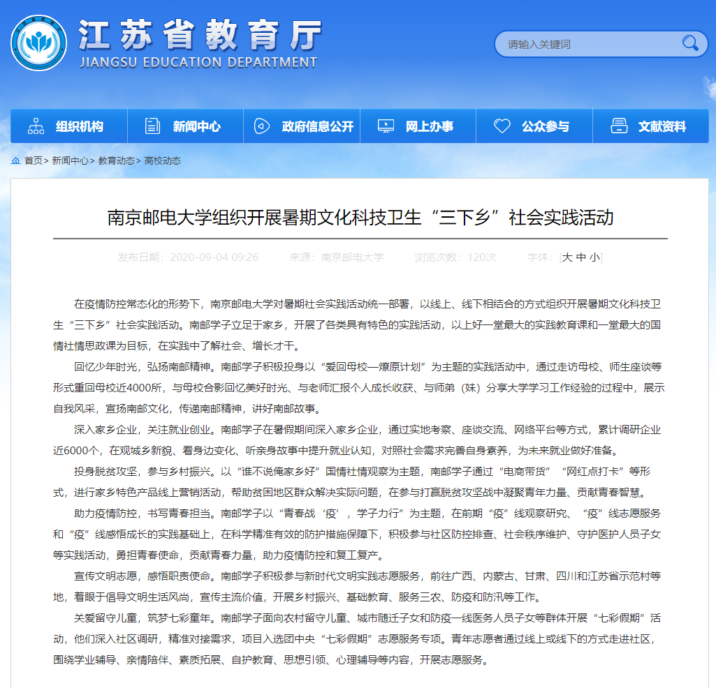【省教育廳官網(wǎng)】南京郵電大學(xué)組織開展暑期文化科技衛(wèi)生“三下鄉(xiāng)”社會實踐活動