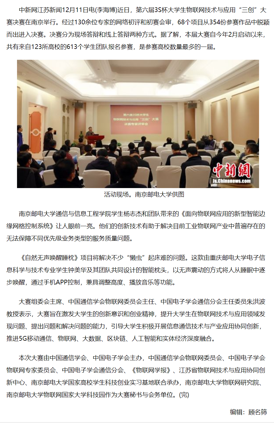 【中國新聞網】3S杯大學生物聯網技術與應用“三創”大賽決賽舉行