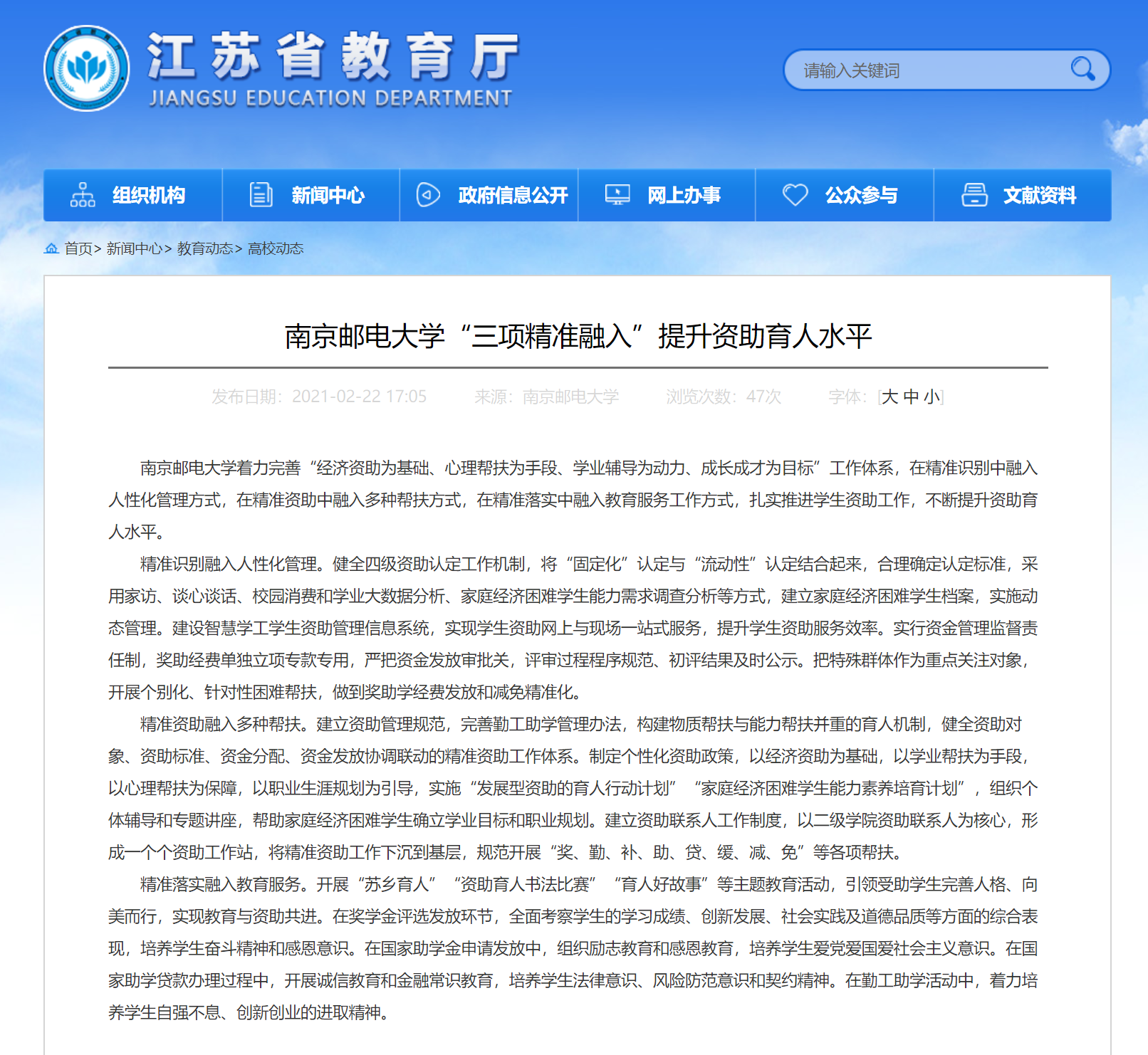 【省教育廳官網】南京郵電大學“三項精準融入”提升資助育人水平