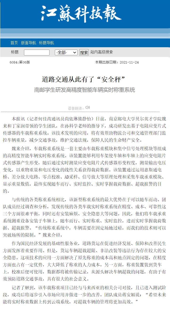 【江蘇科技報】道路交通從此有了“安全秤” 南郵學生研發高精度智能車輛實時稱重系統