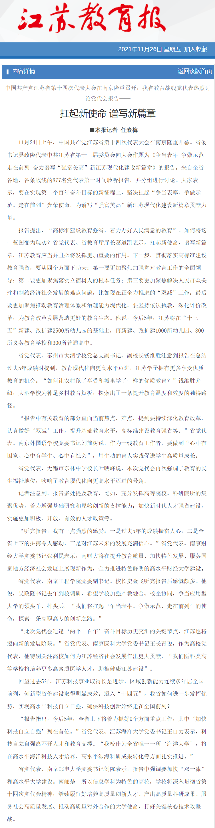【江蘇教育報】中國共產黨江蘇省第十四次代表大會在南京隆重召開,我省教育戰線黨代表熱烈討論黨代會報告—— 扛起新使命 譜寫新篇章