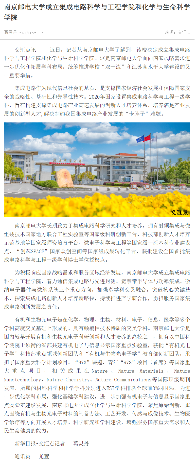【新華日報客戶端】南京郵電大學成立集成電路科學與工程學院和化學與生命科學學院