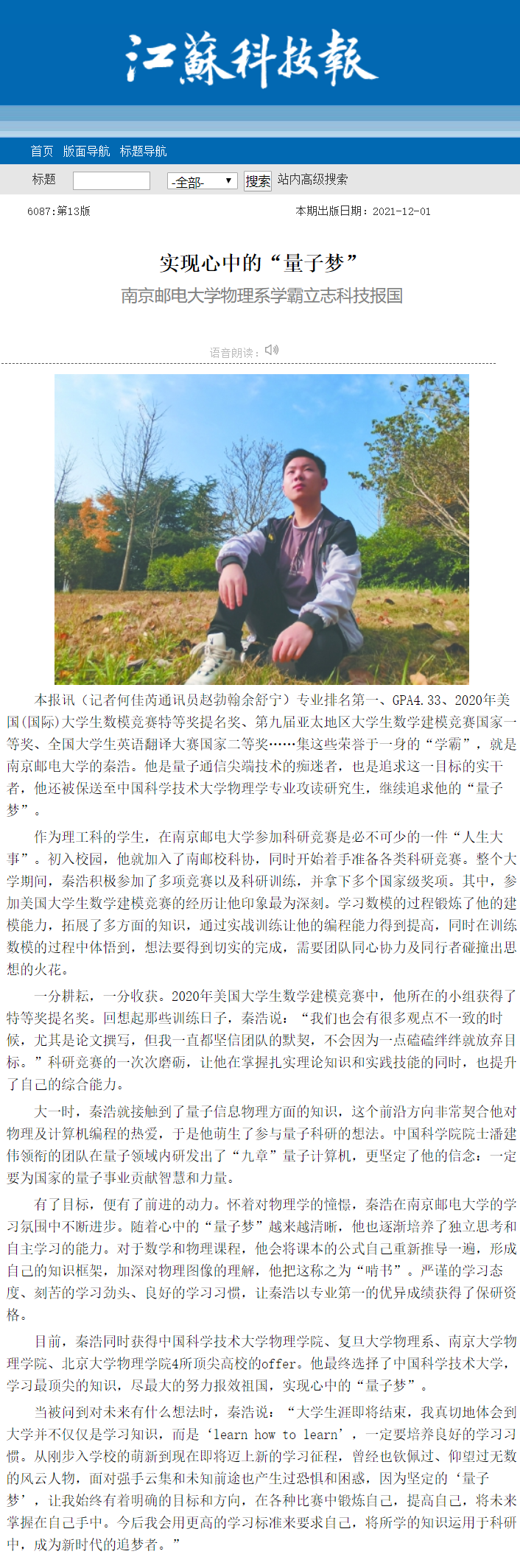 【江蘇科技報】實現心中的“量子夢” 南京郵電大學物理系學霸立志科技報國