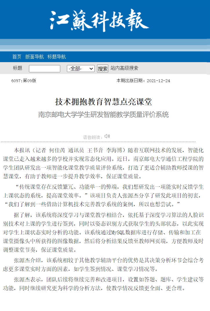 【江蘇科技報】技術(shù)擁抱教育智慧點亮課堂 南京郵電大學(xué)學(xué)生研發(fā)智能教學(xué)質(zhì)量評價系統(tǒng)