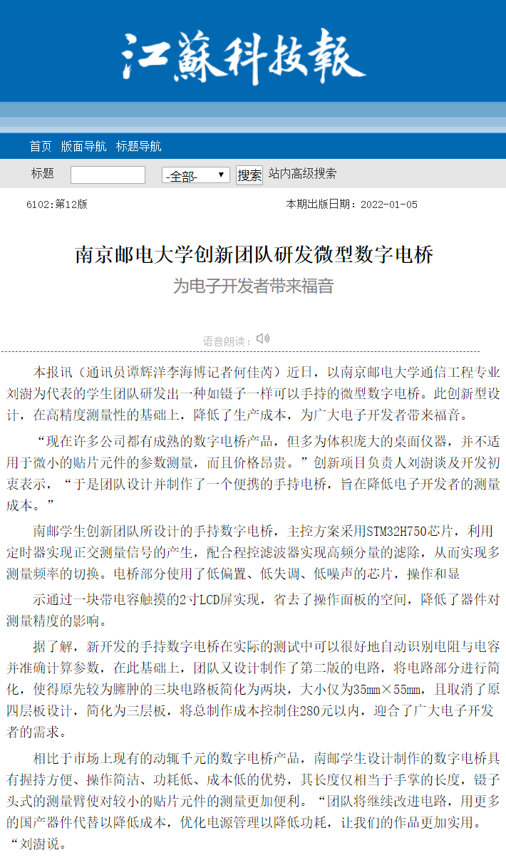 【江蘇科技報(bào)】南京郵電大學(xué)創(chuàng)新團(tuán)隊(duì)研發(fā)微型數(shù)字電橋 為電子開發(fā)者帶來福音